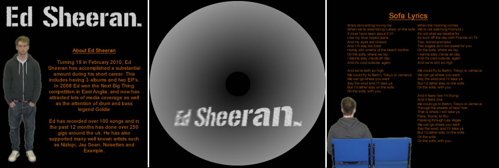 Therefore when I created my Digi-pack I decided to advertise the artist as much as I could and give them a bigger identity, I did this by using lots of pictures of the artists in different locations and poses. I also put the artist’s logo on the back with the song titles over the top allowing people who pick up the product to recognise them more. On the inside of the Digi-pack i placed other images of the artists and also the lyrics to the song we covered with our music video “Sofa” and a brief description of what the artists has been doing over the last few years.